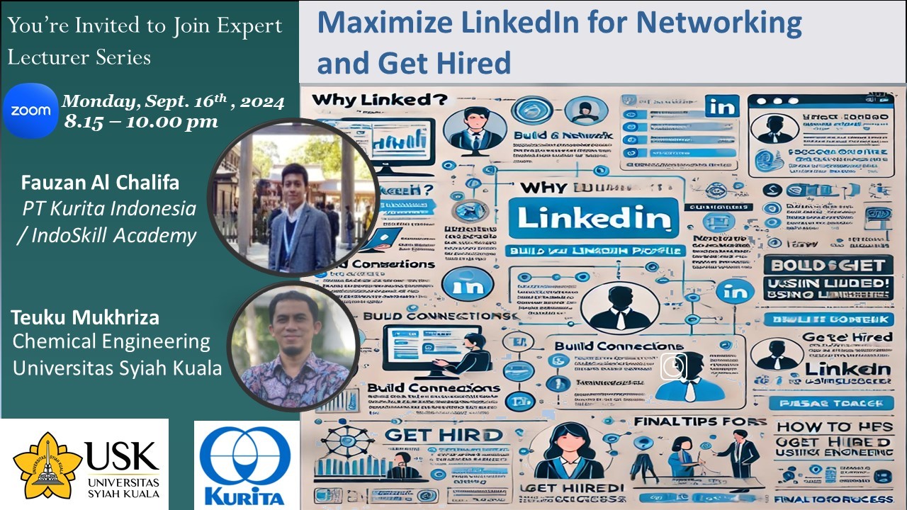 Program Studi Teknik Kimia Universitas Syiah Kuala (USK) menyelenggarakan kuliah tamu pada Senin, 16 September 2024, pukul 08.15–10.00 WIB di Ruang Kuliah Teknik Kimia (RKTK). Kegiatan ini menghadirkan Bapak Fauzan Al Chalifa dari PT Kurita Indonesia/Indoskill Academy sebagai narasumber dengan topik “Maximize LinkedIn for Networking and Get Hired”.